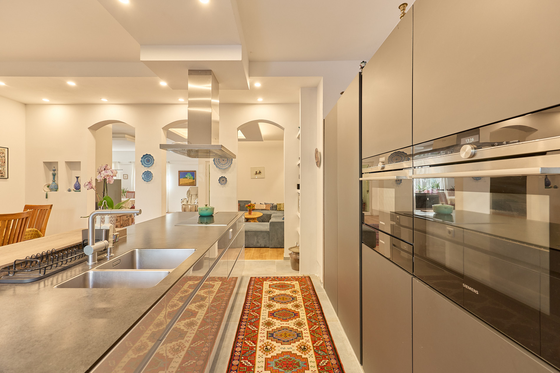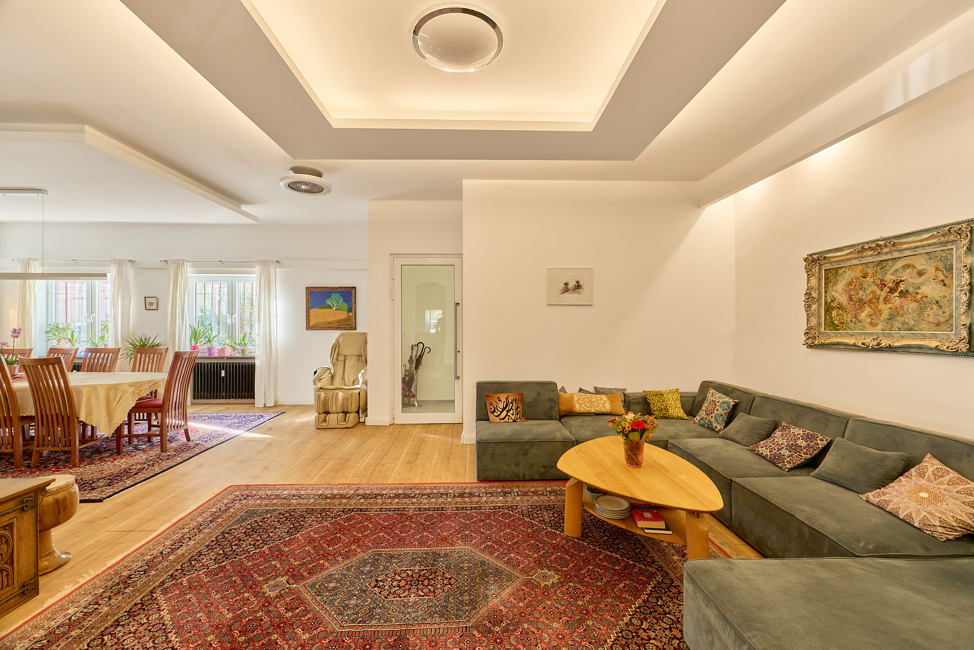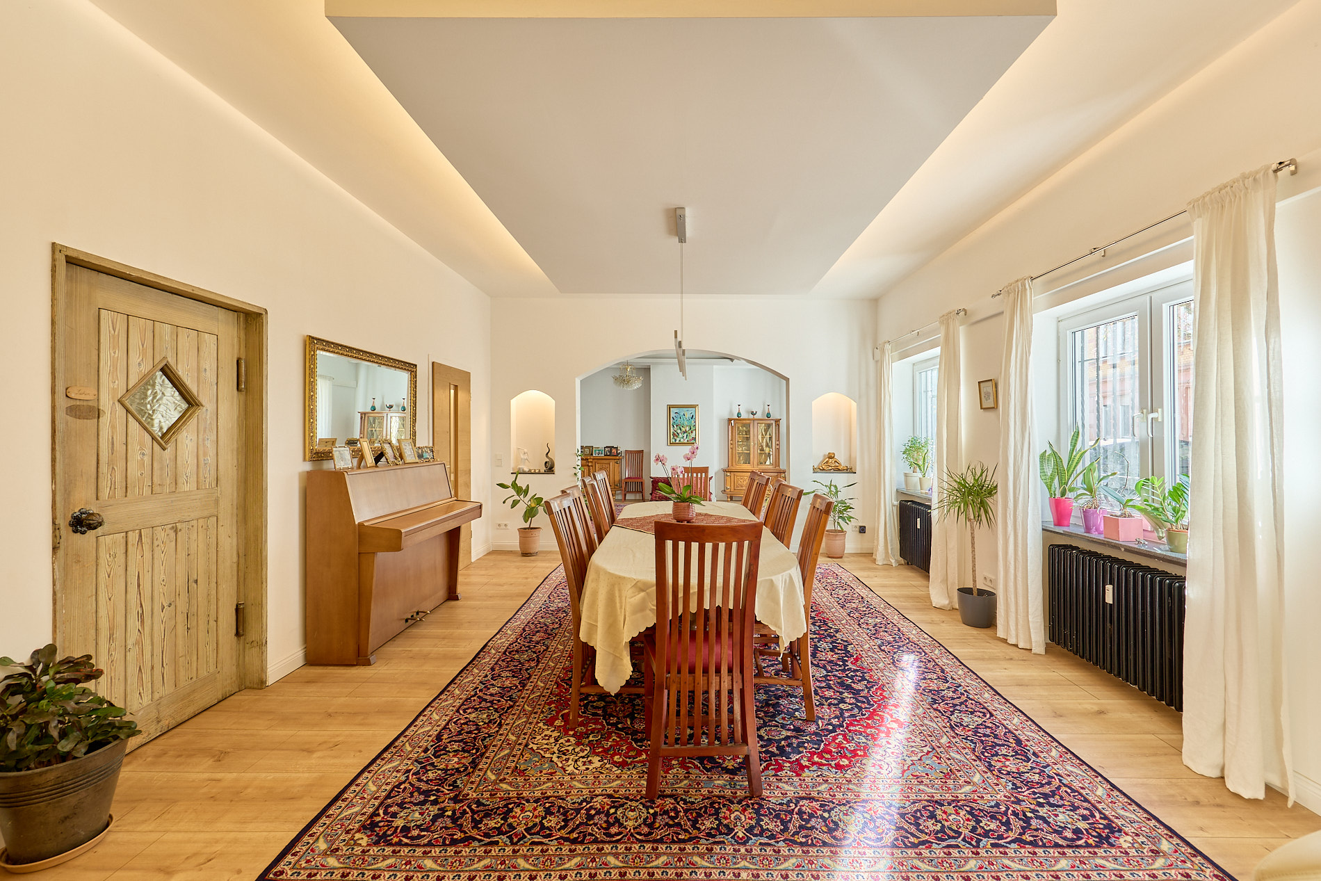 Das Herzstück der Wohnung bildet der weitläufige Wohn-Ess-Koch-Bereich, der sich über vier harmonisch ineinander übergehende Zonen erstreckt. Seine Großzügigkeit wird durch eine außergewöhnliche Deckenhöhe von etwa 3 Metern unterstrichen, die dem Raum eine repräsentative Offenheit verleiht. Die elegante Architektur wird durch Rundbögen zwischen den Räumen sowie feine Stuckelemente für indirekte Beleuchtung ergänzt und lässt eine besonders stimmige Atmosphäre entstehen.