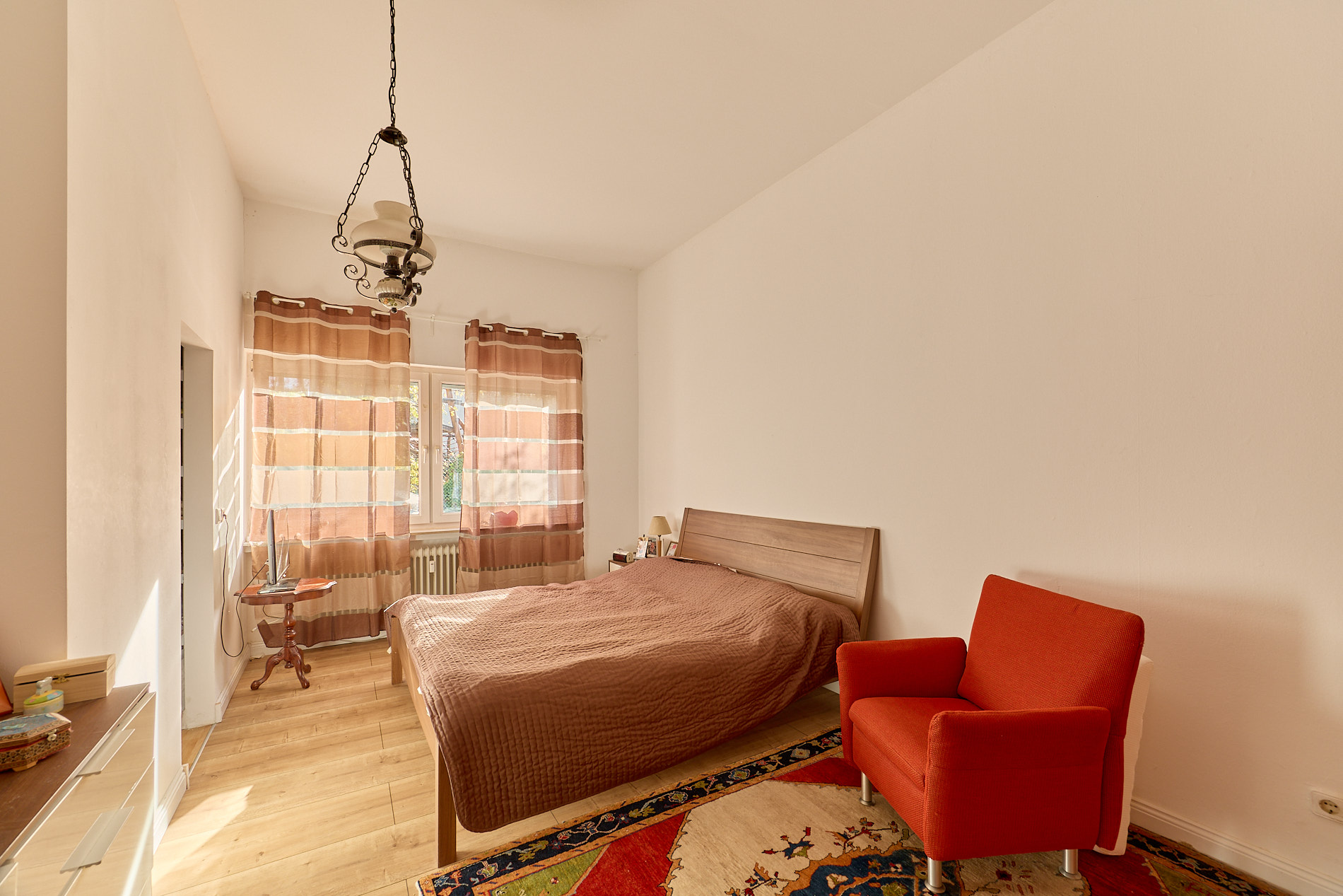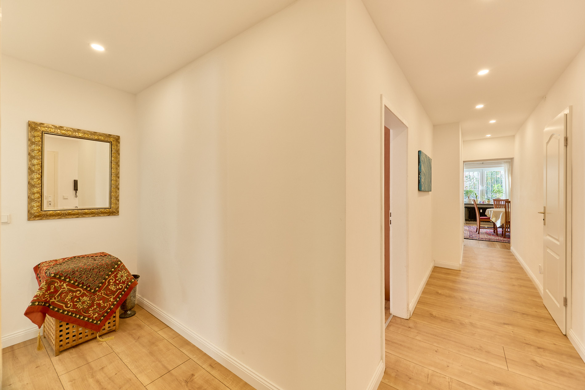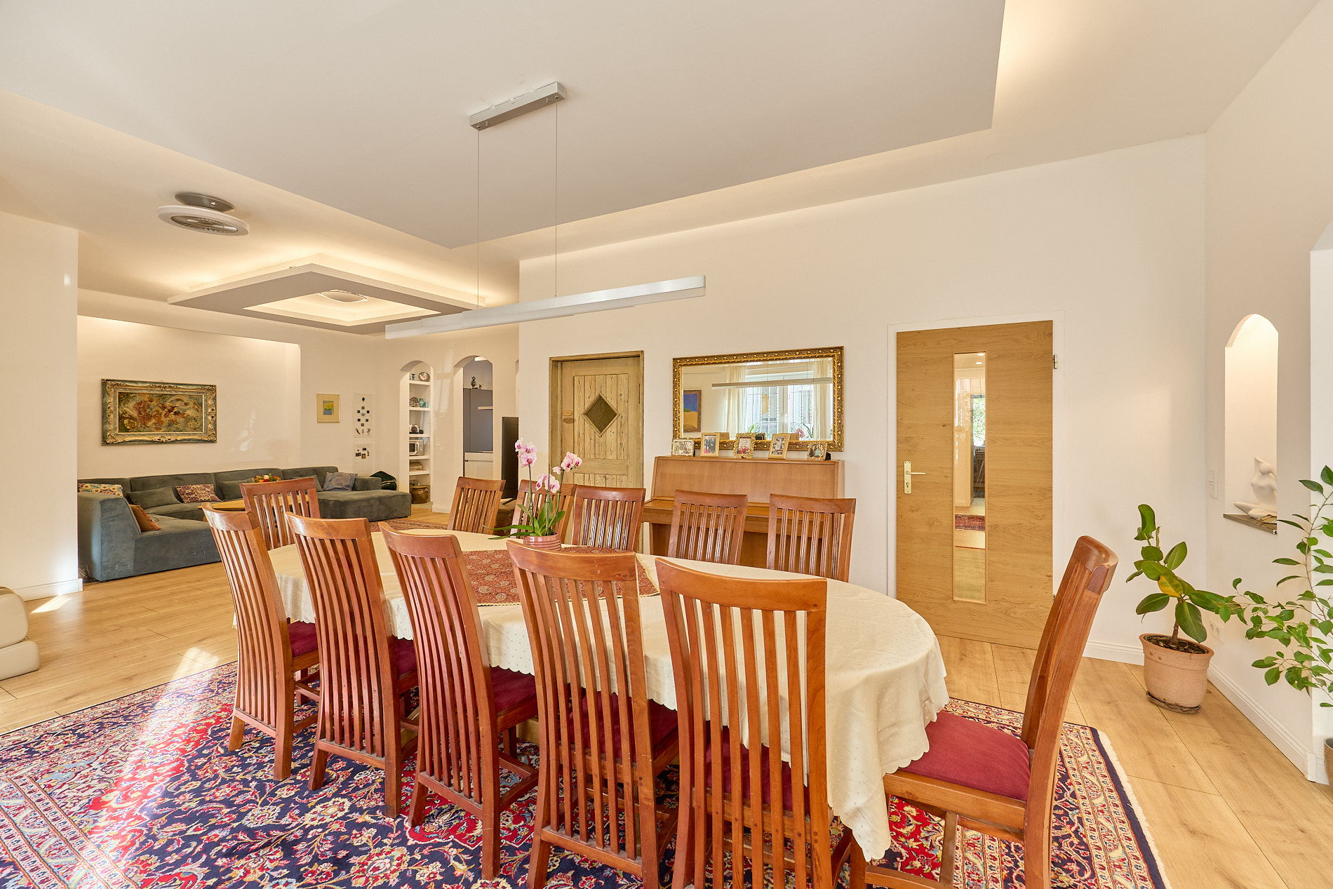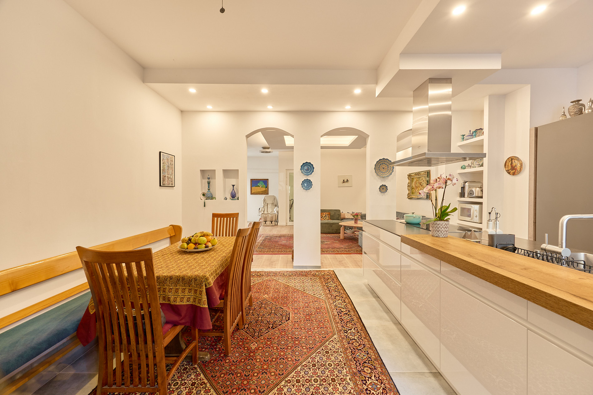 Das Herzstück der Wohnung bildet der weitläufige Wohn-Ess-Koch-Bereich, der sich über vier harmonisch ineinander übergehende Zonen erstreckt. Seine Großzügigkeit wird durch eine außergewöhnliche Deckenhöhe von etwa 3 Metern unterstrichen, die dem Raum eine repräsentative Offenheit verleiht. Die elegante Architektur wird durch Rundbögen zwischen den Räumen sowie feine Stuckelemente für indirekte Beleuchtung ergänzt und lässt eine besonders stimmige Atmosphäre entstehen.