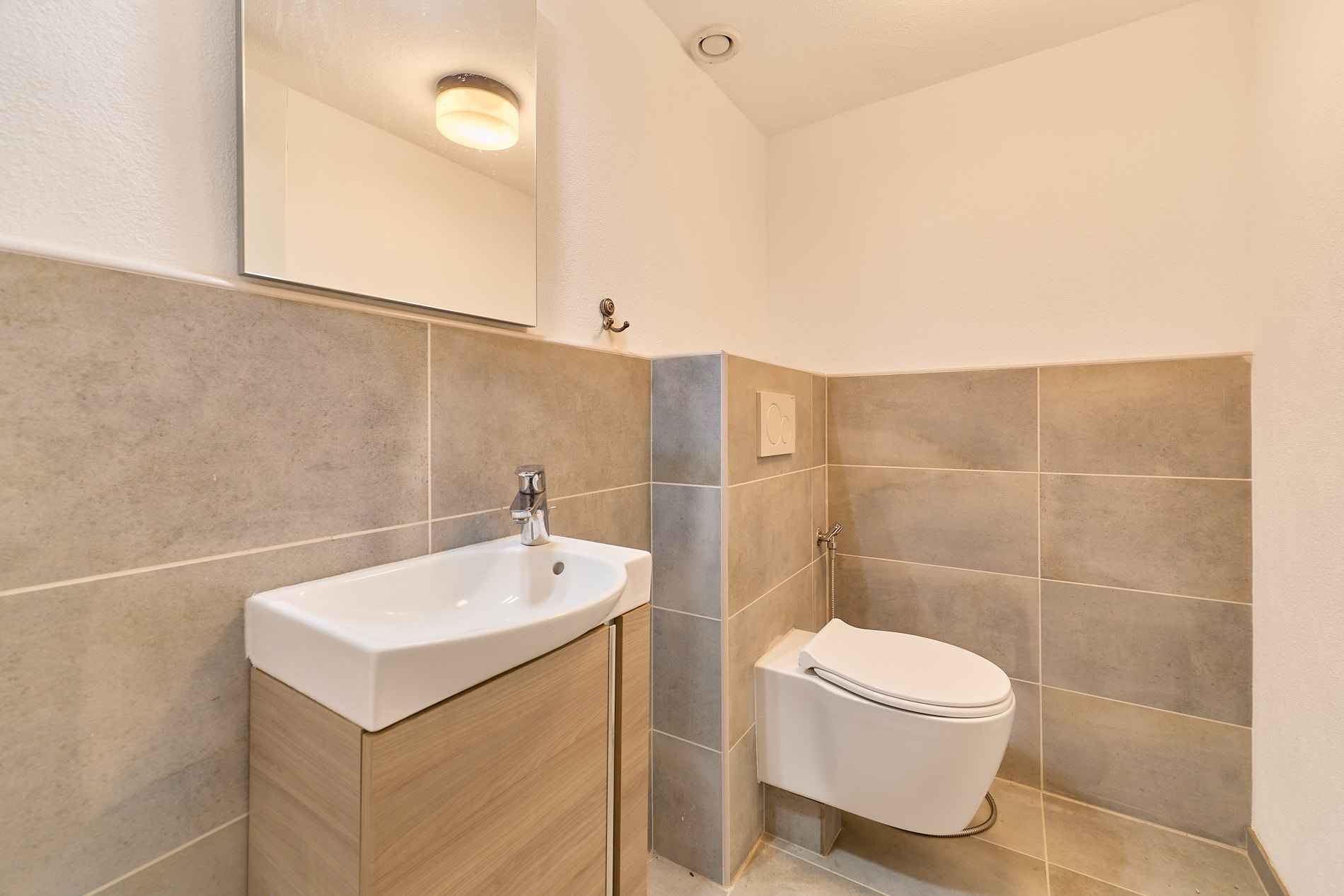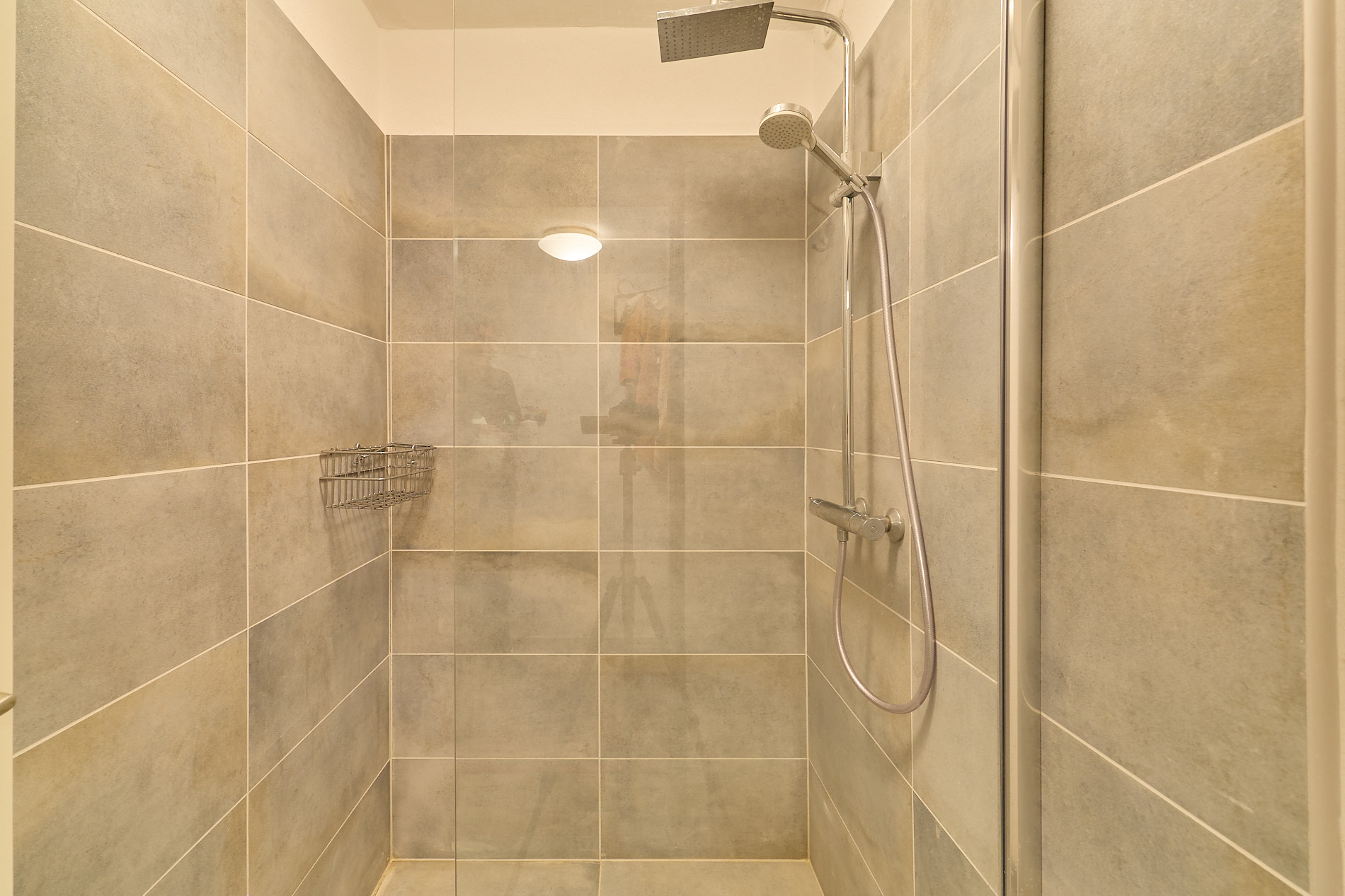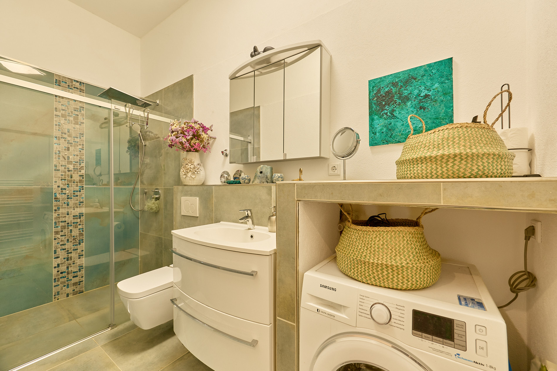 Eine interne Treppe führt in das Untergeschoss mit einem zweiten modernen Duschbad, einem Gäste-WC und mehreren gefliesten Räumen.