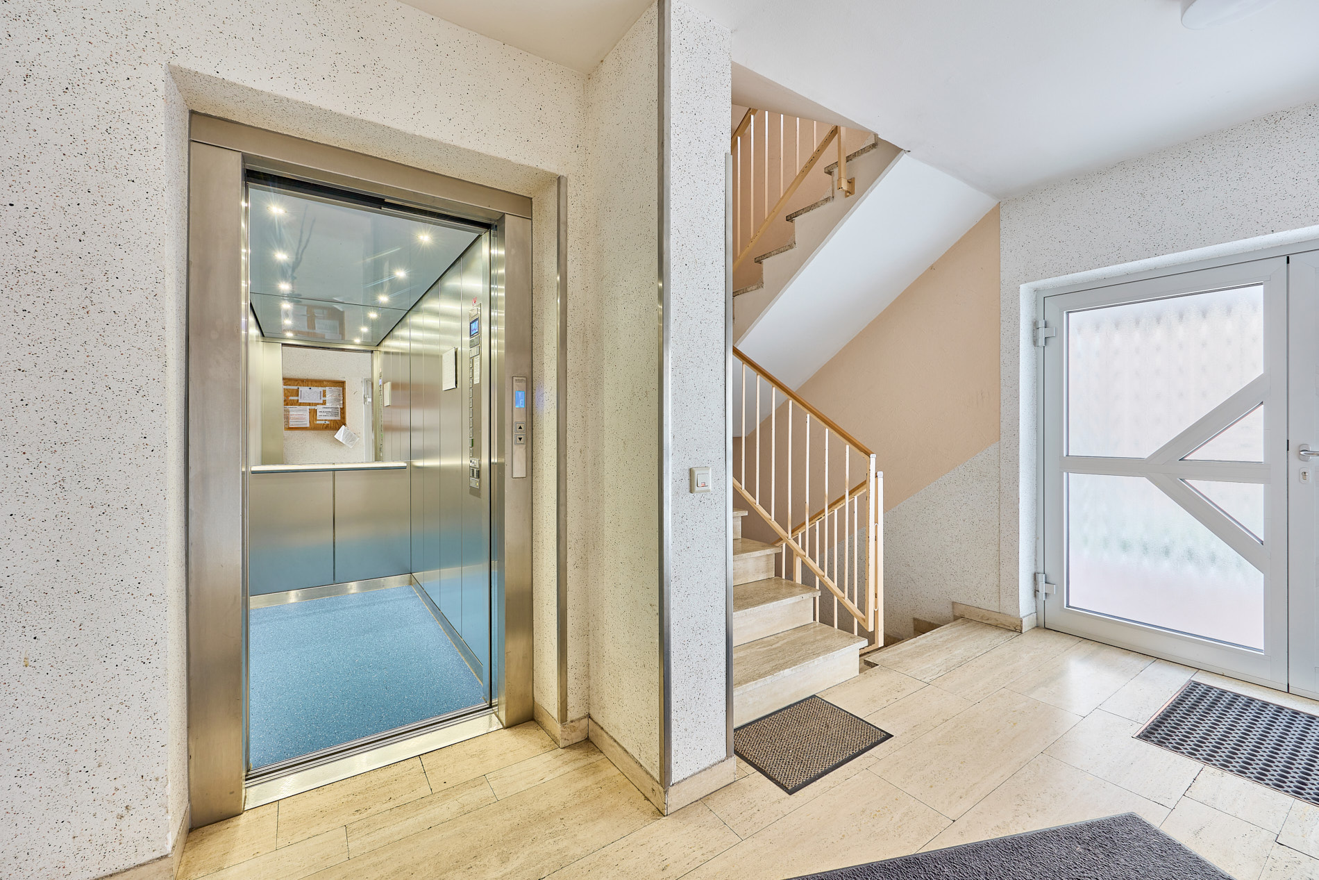 Personenaufzug, Gas-Zentralheizung, 2-Fach verglaste Fensterelemente aus Kunststoff, Badezimmer mit Badewanne und Platz für Waschmaschine, Parkett- und Laminatböden