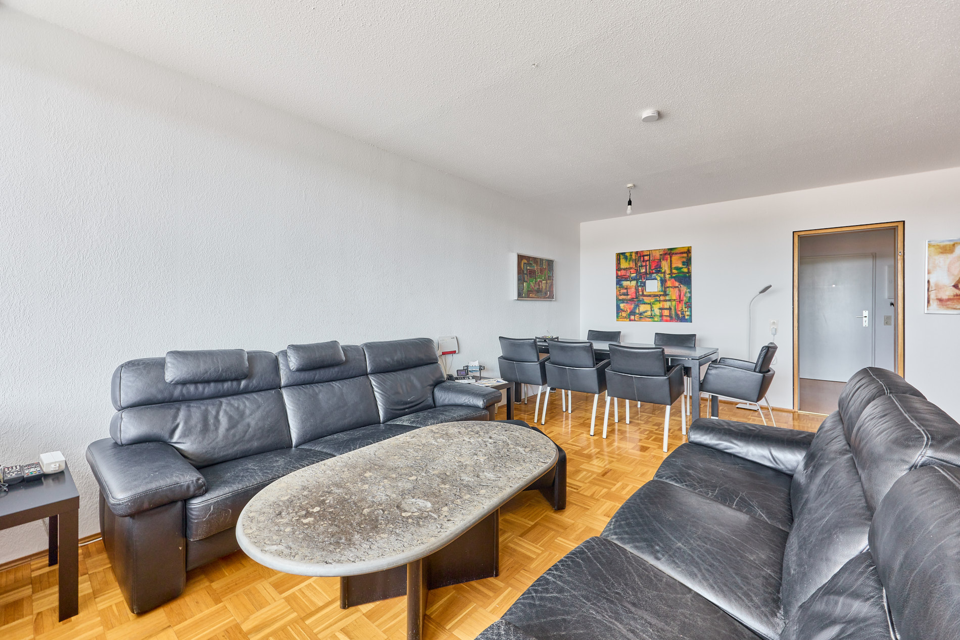 Der lichtdurchflutete Wohn- und Essbereich mit großer, überdachter Loggia bildet das Herzstück der Wohnung und schafft mit seiner Offenheit und dem Fernblick durch die großen Fensterflächen ein einladendes Ambiente. Ergänzt wird dieser Bereich durch eine separate Küche mit Platz für einen kleinen Frühstückstisch sowie einen Eingangsflur, der genügend Raum für Garderobe und Ähnliches bietet.