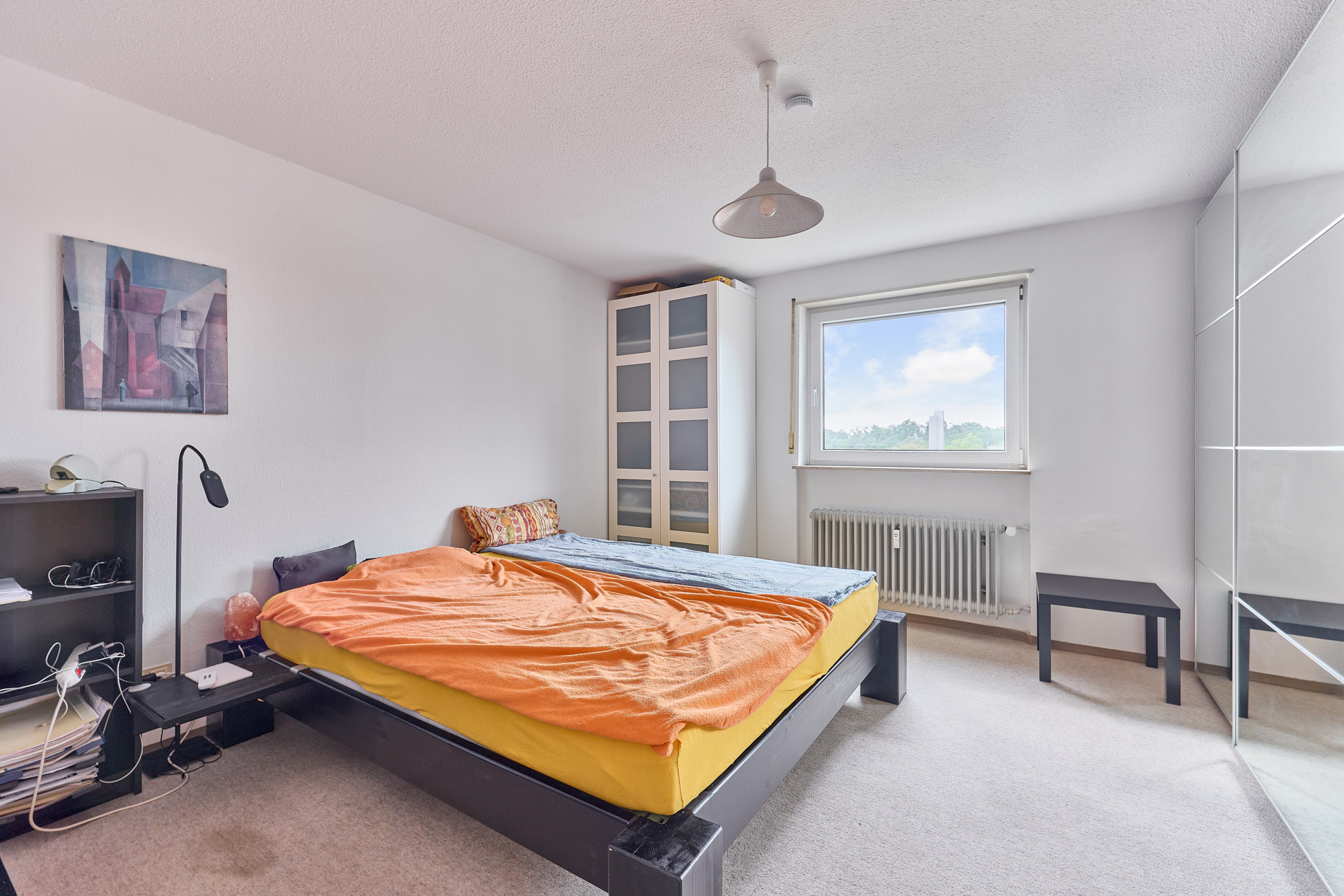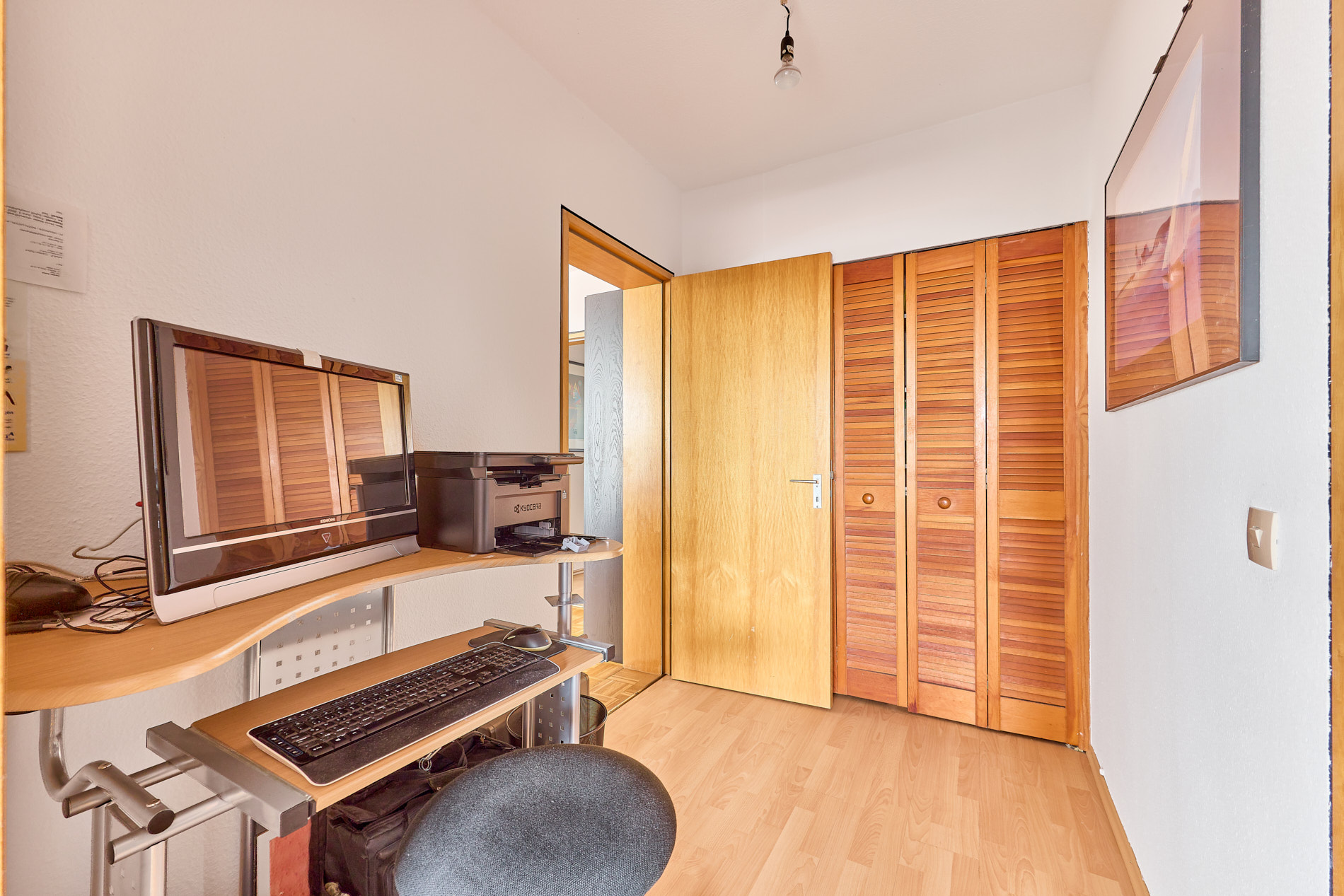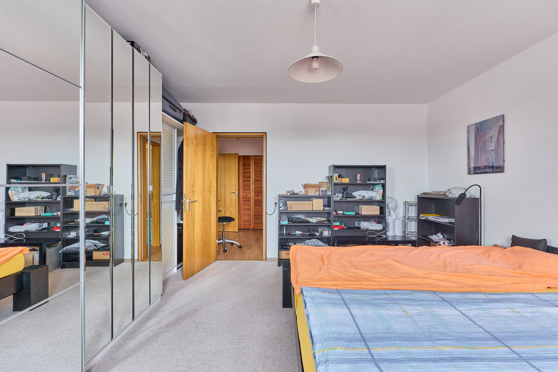Über einen weiteren Flur, der sowohl eine Abstellkammer als auch eine ideale Ecke für einen Arbeitstisch bietet, gelangt man in den privaten Bereich mit großem Schlafzimmer und geräumigem Bad. Auch hier herrscht durch die angenehme Größe der Räume und dem Weitblick durch die Fensterflächen eine entspannte und wohltuende Atmosphäre.